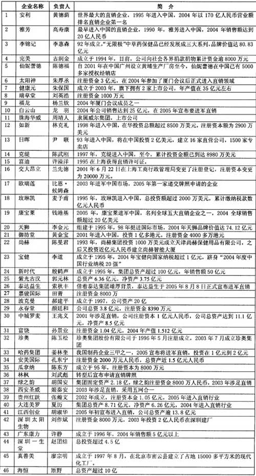 为了给读者一个指导,本刊目前特组织了对市场上比较活跃的82家直销或准直销公司进行了关于是否申请首批直销牌照的调查。调查结果显示,这些企业中有46家直销企业明确表示会积极申请第一批直销牌照;有16家直销企业尚待确定是否要申请直销牌照;而有20家企业直接宣称不会申请直销牌照。各公司具体申请情况以公司最终正式公布为准,本表仅供参考。